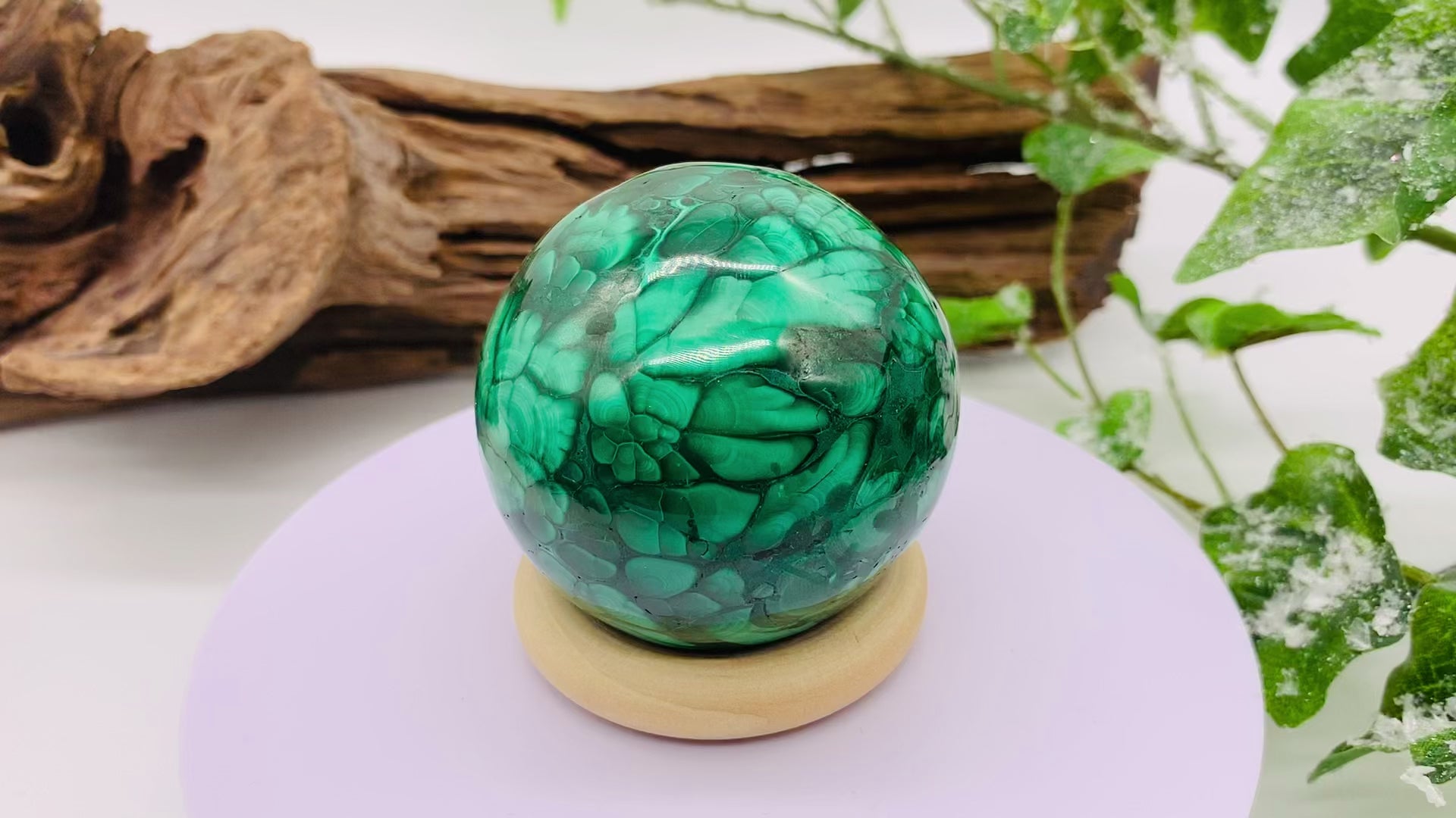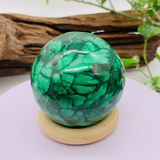 A malachite sphere with stunning patterns, from the Congo.